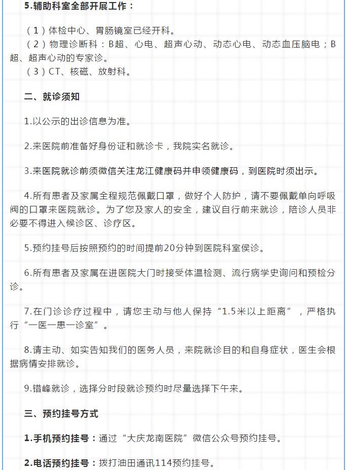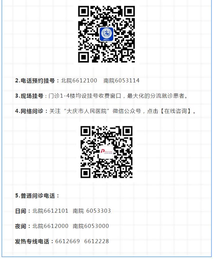 1.电话预约:时间为7:30-20;00,可通过关注大庆市中西医结合医院微信公众号 ,了解出诊医生信息,预约内科6176001,预约外科、妇科、产科、肛肠科6176002,预约中医科、儿科、皮肤科、消化科6166035。