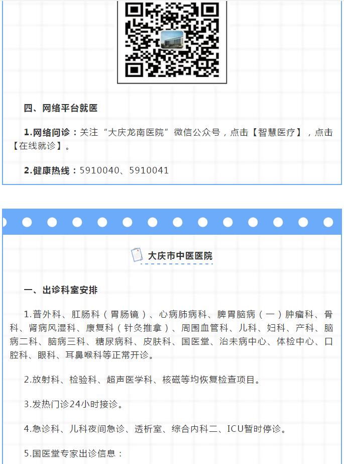 2.网上预约:健康龙江预约挂号步骤:微信登录后→扫一扫→健康龙江服务二维码 →点击健康龙江服务平台→关注公众号→关注后点击健康龙江首页→进入后点击就诊助手→预约挂号→搜索大庆市中西医结合医院→点击大庆市中西医结合医院→点击预约挂号→选择科室及医生,进行网上预约挂号