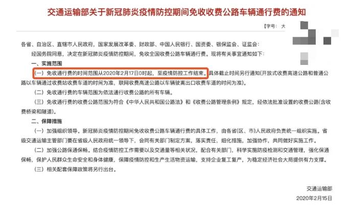 根据疫情防控需要,经国务院同意,从2月17日0时起至疫情防控工作结束,所有依法通行收费公路的车辆免收通行费。