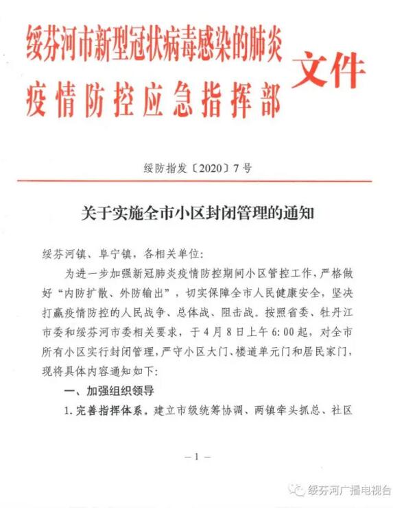 绥芬河市新冠肺炎疫情防控指挥部4月7日发布通知,为进一步加强新冠肺炎疫情防控期间的管控工作,严格做好“内防扩散,外防输入”,位于黑龙江省中俄边境的绥芬河市所有小区,自4月8日6时起实行封闭管理,严守小区大门、楼道单元门和居民家门。