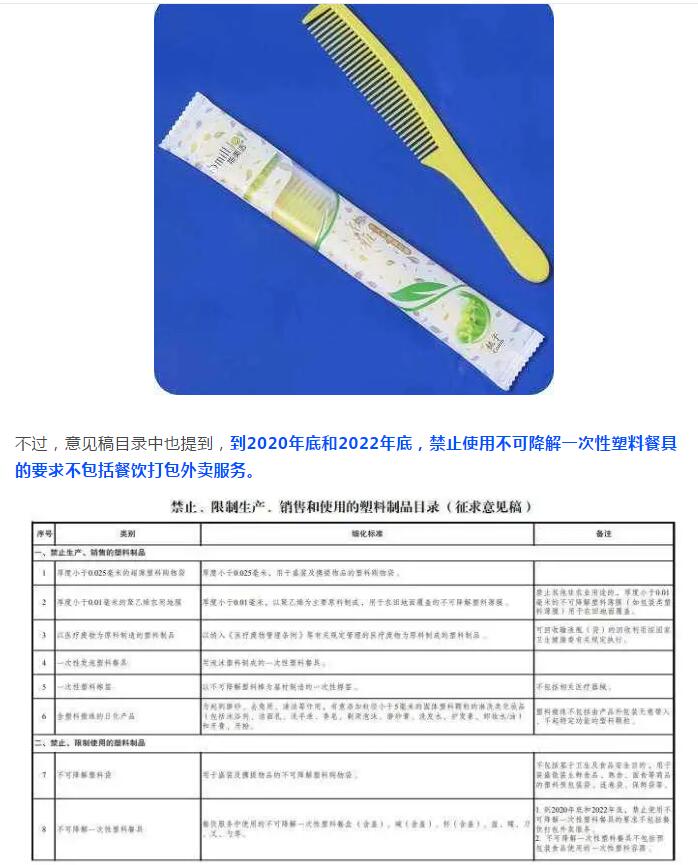 4月10日,国家发改委发布关于《禁止、限制生产、销售和使用的塑料制品目录(征求意见稿)》公开征求意见。意见稿提出,以医疗废物为原料制造的塑料制品、含塑料微珠的日化产品等六大类塑料制品拟禁止生产、销售。宾馆、酒店一次性塑料用品、快递塑料包装等拟禁止、限制使用。