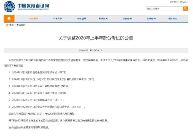 为落实国家关于新冠肺炎疫情防控工作部署及教育部相关通知要求,切实保障考生、考试工作人员的身体健康和生命安全,经研究决定,取消原定于2020年上半年举行的以下考试项目: