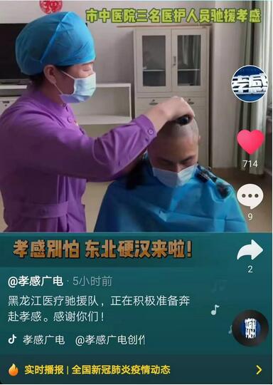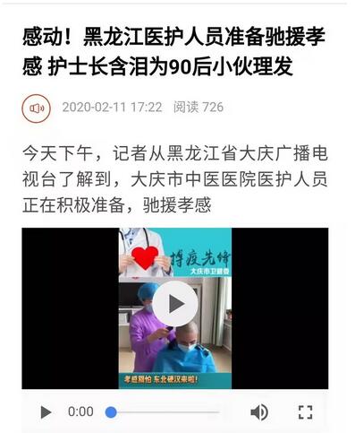 昨天下午,大庆广播电视台融媒体中心记者拍下大庆市中医医院医护人员积极准备驰援孝感,出发前感人的一幕。护士长含泪为即将去孝感的医护人员剃头发。