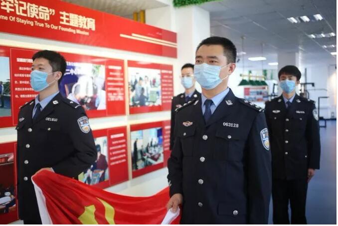 宣誓仪式上,新发展预备党员面对党旗庄严宣誓。宣誓后,预备党员所在党组织负责人为他们佩戴党徽。33名入党积极分子观看宣誓仪式并参观了市公安局党员活动中心。