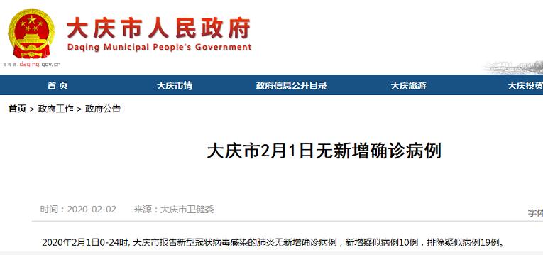 2020年2月1日0-24时, 大庆市报告新型冠状病毒感染的肺炎无新增确诊病例,新增疑似病例10例,排除疑似病例19例。