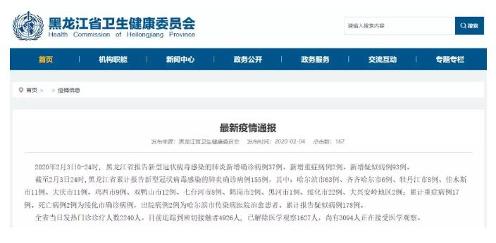 2020年2月3日0-24时,黑龙江省报告新型冠状病毒感染的肺炎新增确诊病例37例。新增重症病例2例。新增疑似病例93例。