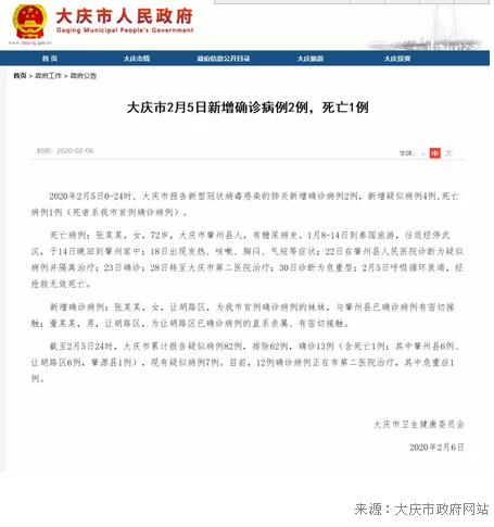 2020年2月5日0-24时, 大庆市报告新型冠状病毒感染的肺炎新增确诊病例2例,新增疑似病例4例,死亡病例1例(死者系我市首例确诊病例)。