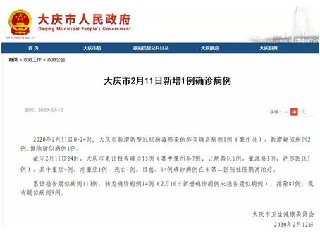 2020年2月11日0-24时, 大庆市新增新型冠状病毒感染的肺炎确诊病例1例(肇州县),新增疑似病例2例,排除疑似病例1例。