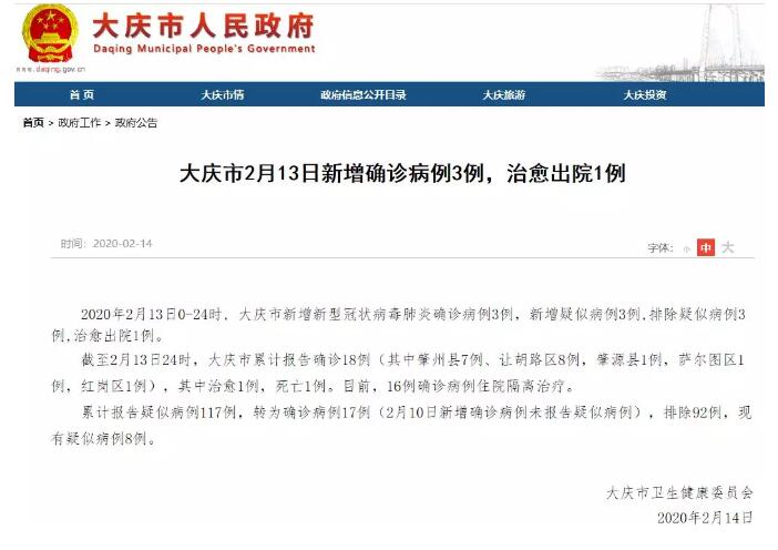 截至2月13日24时,大庆市累计报告确诊18例(其中肇州县7例、让胡路区8例,肇源县1例,萨尔图区1例,红岗区1例),其中治愈1例,死亡1例。目前,16例确诊病例住院隔离治疗。