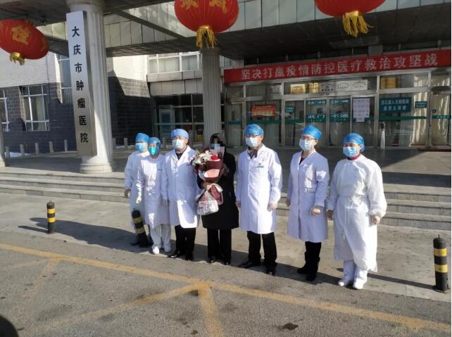 患者刘某,女,56岁,黑龙江省肇州县人,2020年1月28日确诊为新型冠状病毒肺炎确诊病例。在大庆市新冠疫情定点救治中心住院隔离治疗,经过医护人员的精心治疗和护理,患者已平温三天以上,临床症状明显改善,肺部影像学显示明显吸收,连续两次2019-nCOV核酸检测阴性。经大庆市新冠疫情定点救治中心专家会诊,符合《新型冠状病毒肺炎诊疗方案》(试行第五版 修正版)解除隔离出院标准,今日出院。
