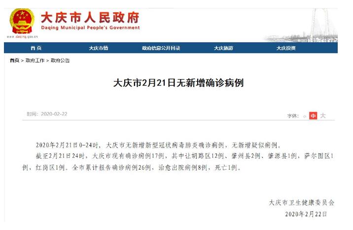 截至2月21日24时,大庆市现有确诊病例17例,其中让胡路区12例、肇州县2例、肇源县1例,萨尔图区1例,红岗区1例。全市累计报告确诊病例26例,治愈出院病例8例,死亡1例。