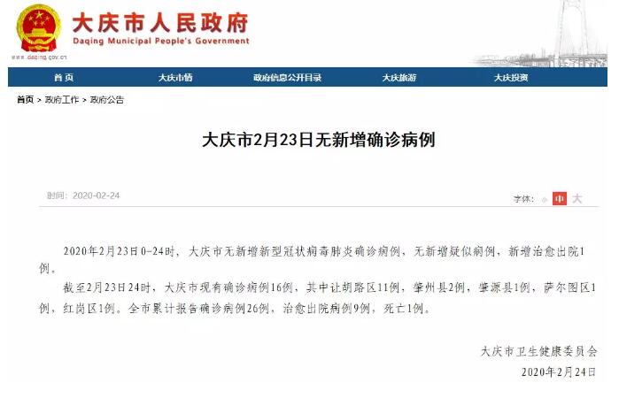 截至2月23日24时,大庆市现有确诊病例16例,其中让胡路区11例,肇州县2例,肇源县1例,萨尔图区1例,红岗区1例。全市累计报告确诊病例26例,治愈出院病例9例,死亡1例。
