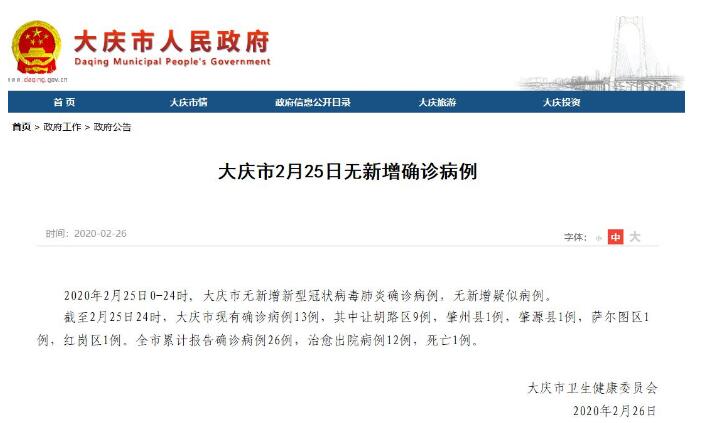 截至2月25日24时,大庆市现有确诊病例13例,其中让胡路区9例,肇州县1例,肇源县1例,萨尔图区1例,红岗区1例。全市累计报告确诊病例26例,治愈出院病例12例,死亡1例。