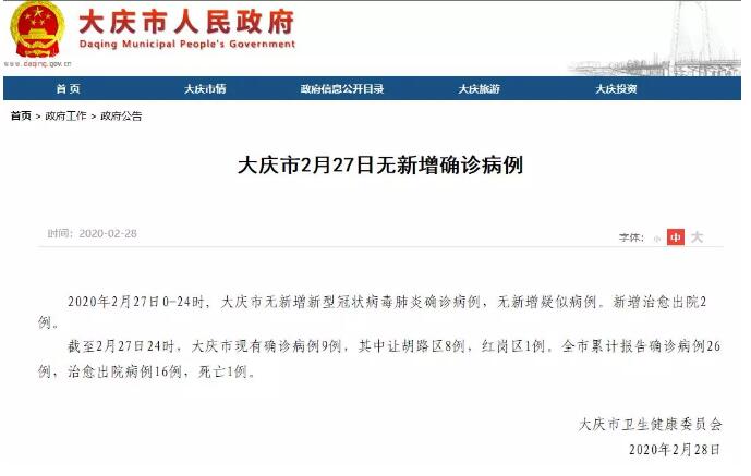 截至2月27日24时,大庆市现有确诊病例9例,其中让胡路区8例,红岗区1例。全市累计报告确诊病例26例,治愈出院病例16例,死亡1例。