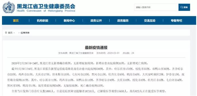2020年2月29日0-24时,黑龙江省无新增确诊病例。无新增疑似病例。新增治愈出院病例35例。无新增死亡病例。
