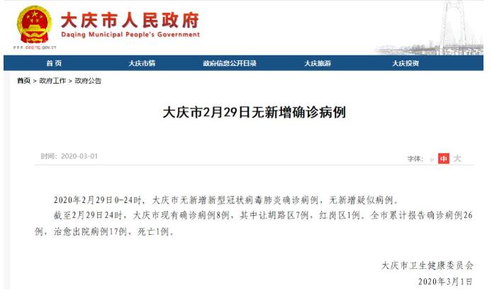 截至2月29日24时,大庆市现有确诊病例8例,其中让胡路区7例,红岗区1例。全市累计报告确诊病例26例,治愈出院病例17例,死亡1例。