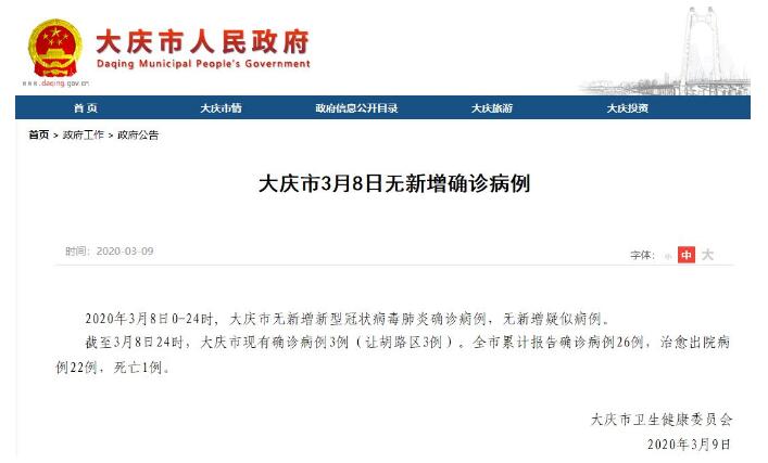 截至3月8日24时,大庆市现有确诊病例3例(让胡路区3例)。全市累计报告确诊病例26例,治愈出院病例22例,死亡1例。