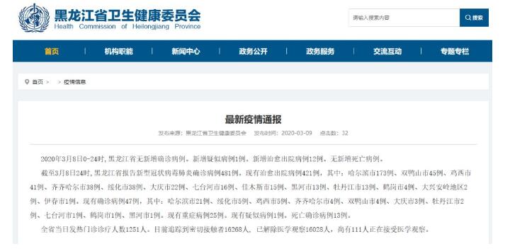 2020年3月8日0-24时,黑龙江省无新增确诊病例。新增疑似病例1例。新增治愈出院病例12例。无新增死亡病例。