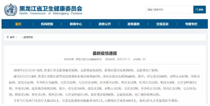 2020年3月12日0-24时,黑龙江省无新增确诊病例。无新增疑似病例。新增治愈出院病例6例。无新增死亡病例。