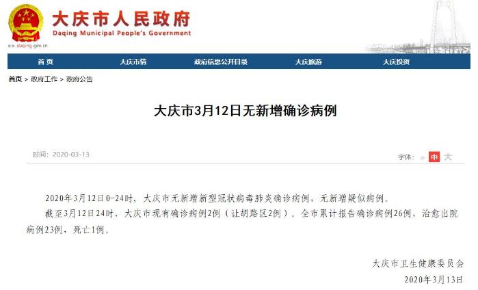 截至3月12日24时,大庆市现有确诊病例2例(让胡路区2例)。全市累计报告确诊病例26例,治愈出院病例23例,死亡1例。