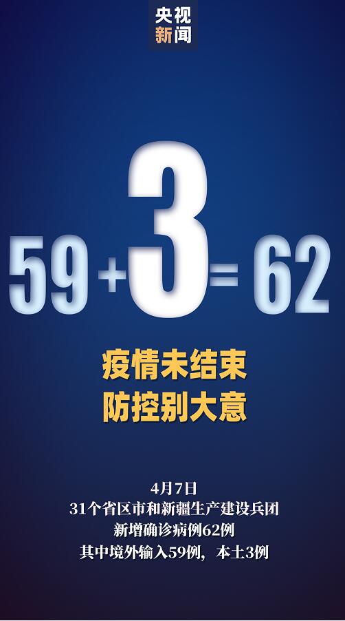 4月7日0—24时,31个省(自治区、直辖市)和新疆生产建设兵团报告新增确诊病例62例,其中59例为境外输入病例,3例为本土病例(山东2例,广东1例);新增死亡病例2例(上海1例,湖北1例);新增疑似病例12例,其中11例为境外输入病例,1例为本土病例(广东1例)。