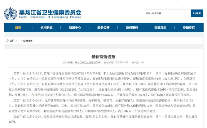 2020年4月21日0-24时,黑龙江省省内新增确诊病例7例(哈尔滨7例,本土无症状感染者转为确诊病例1例),其中:有4例是确诊病例陈某君(男,87岁)在哈医大一院住院期间同楼层同病区的住院患者、有3例为同期间住院患者陪护。新增无症状感染者1例(哈尔滨1例),为陈某君(男,87岁)在哈医大一院住院期间同楼层同病区的患者(21日新增确诊病例)陪护。截至4月21日24时,累计报告本土确诊病例537例,累计治愈出院病例470例,现有确诊病例54例(哈尔滨52例、牡丹江2例),现有疑似病例1例(大庆),现有无症状感染者30例(哈尔滨23例、牡丹江5例、绥化2例)。当日发热门诊诊疗人数1052人。累计追踪到密切接触者18087人,已解除医学观察16539人,尚有1548人正在接受医学观察。