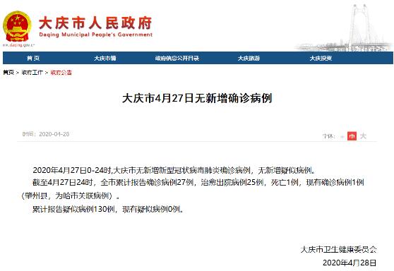 2020年4月27日0-24时,大庆市无新增新型冠状病毒肺炎确诊病例,无新增疑似病例。