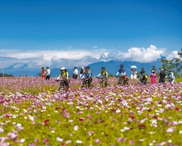 四川省成都市温江区寿安镇,市民在花海里骑行。近年来,越来越多人走到户外,运动健身、赏景休闲,践行绿色低碳的生活方式。王明峰 张志强 摄影报道
