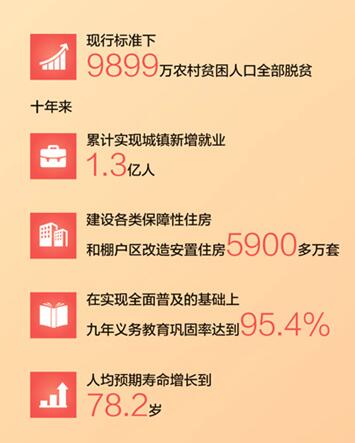 十年来,在党的坚强领导下,我们踔厉奋发、团结奋斗,发展的阳光照进每个人的生活。学前教育、义务教育达到世界高收入国家平均水平,城镇新增就业年均1300万人以上,居民人均可支配收入比2012年增长近八成,建成世界上规模最大的社会保障体系,覆盖城乡的医疗卫生服务三级网络不断健全,保障性安居工程让1.4亿多群众圆了安居梦,天更蓝、水更清、家园更美……新时代的历史性成就和历史性变革,镌刻在山河锦绣、城乡巨变,书写于物阜民丰、万家灯火。