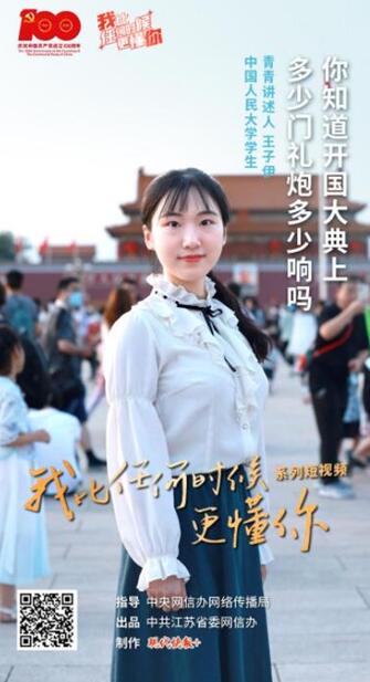 点击图片观看视频 未来属于青年,希望寄予青年。由中央网信办网络传播局指导、中共江苏省委网信办出品、现代快报+制作的"我比任何时候更懂你"系列短视频燃情上线。现代快报联合全国30所高校、30个青青讲述人团队,奔赴全国21个城市,走进全国26家红色场馆,行程12000多公里,讲述30个党史故事。"我比任何时候更懂你",这是最青春的追寻和响应,这是青年人对百年大党最深情的告白! 8月15日,"我比任何时候更懂你"系列短视频第22集《你知道开国大典上多少门礼炮多少响吗?》上线。本集青青讲述人是中国人民大学学生王子伊。 1949年10月1日,毛泽东在天安门城楼上庄严宣布:"中华人民共和国中央人民政府今天成立了!"随后,毛泽东亲手按动电钮,伴着《义勇军进行曲》,新中国第一面五星红旗冉冉升起,54门礼炮齐鸣28响,26架飞机飞过天安门上空。 历史是最好的教科书。"今年是建党100周年,百年峥嵘岁月记录着无数革命先辈前赴后继,为建设美好家园甘愿赴汤蹈火的初心奋斗史。"讲述完开国大典这段历史后,王子伊感触颇多,"如今我们从先辈手里接下接力棒,身上肩负着实现中华民族伟大复兴的责任,身为新青年,我们责无旁贷,所以更要争当有理想有本领有担当的时代新人,为祖国的发展建设增添一份力,实现自我价值。" 现代快报全媒体记者周明张爱红 |