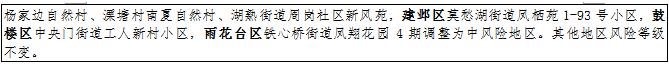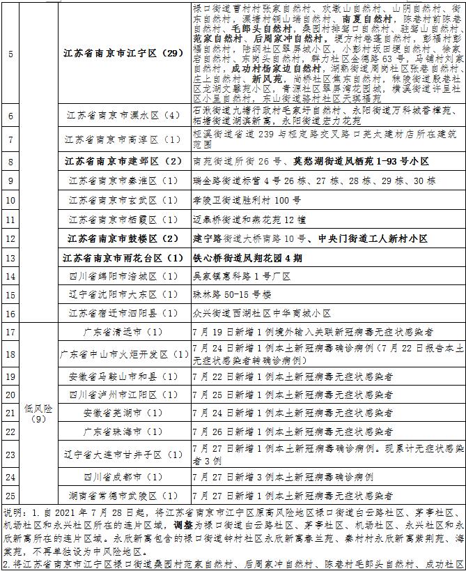 自2021年7月28日起,将江苏省南京市江宁区原高风险地区禄口街道白云路社区、茅亭社区、机场社区和永兴社区所在的连片区域,调整为禄口街道白云路社区、茅亭社区、机场社区、永兴社区和永欣新寓所在的连片区域。永欣新寓包含的禄口街道钟村社区永欣新寓春兰苑、秦村村永欣新寓紫荆苑、海棠苑,不再单独设为中风险地区。将江苏省南京市江宁区禄口街道桑园村范家自然村、后周家冲自然村、陈巷村毛郎头自然村、成功社区杨家边自然村、溧塘村南夏自然村、湖熟街道周岗社区新风苑,建邺区莫愁湖街道凤栖苑1-93号小区,鼓楼区中央门街道工人新村小区,雨花台区铁心桥街道凤翔花园4期调整为中风险地区。其他地区风险等级不变。 今日第3次调整国内近期有报告本土病例风险地区一览表