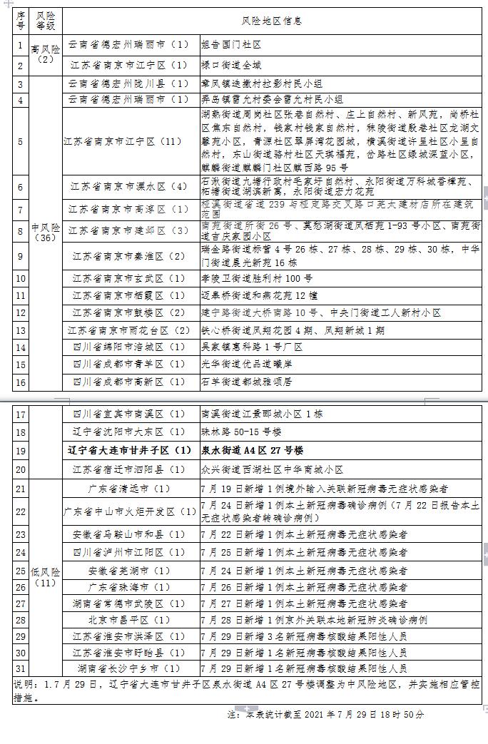 7月29日,辽宁省大连市甘井子区泉水街道A4区27号楼调整为中风险地区,其他地区风险等级不变。
