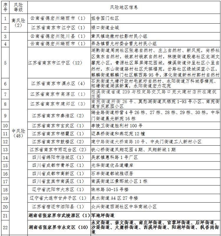 自2021年7月30日起,将湖南省张家界市武陵源区军地坪街道,张家界市永定区永定街道、崇文街道、南庄坪街道、官黎坪街道、后坪街道、沙堤街道、大庸桥街道、西溪坪街道、阳湖坪街道、枫香岗街道调整为中风险地区。