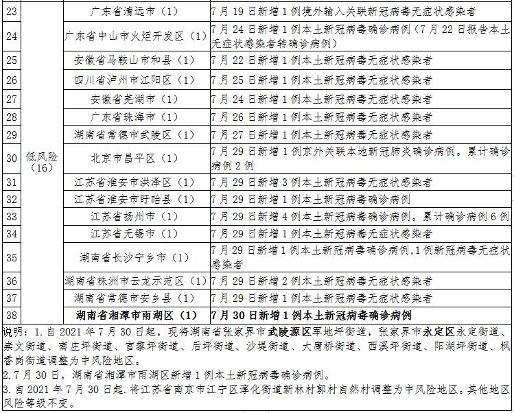 自2021年7月30日起,将江苏省南京市江宁区淳化街道新林村郭村自然村调整为中风险地区。其他地区风险等级不变。