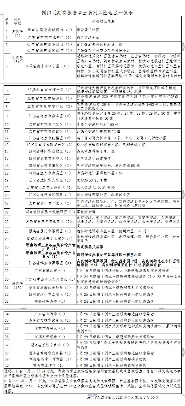 自2021年7月30日起,江苏省淮安市洪泽区高良涧街道洪泽园三村宏盛家园十栋、高良涧街道崔朱社区泽地华城12栋、高良涧街道王庄村13组胡桑田庄台风险等级调整为中风险,其他地区风险等级不变。