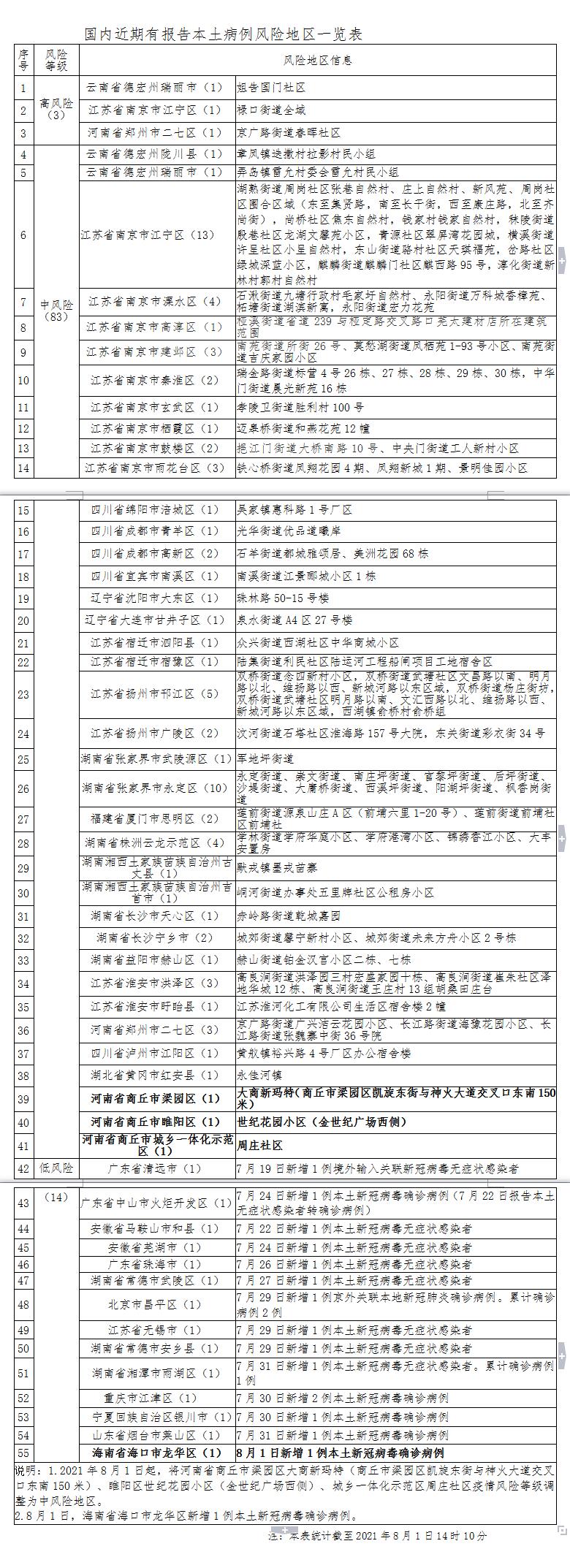 河南省商丘市新增3处中风险地区,海南省海口市新增1处确诊病例的低风险地区。
