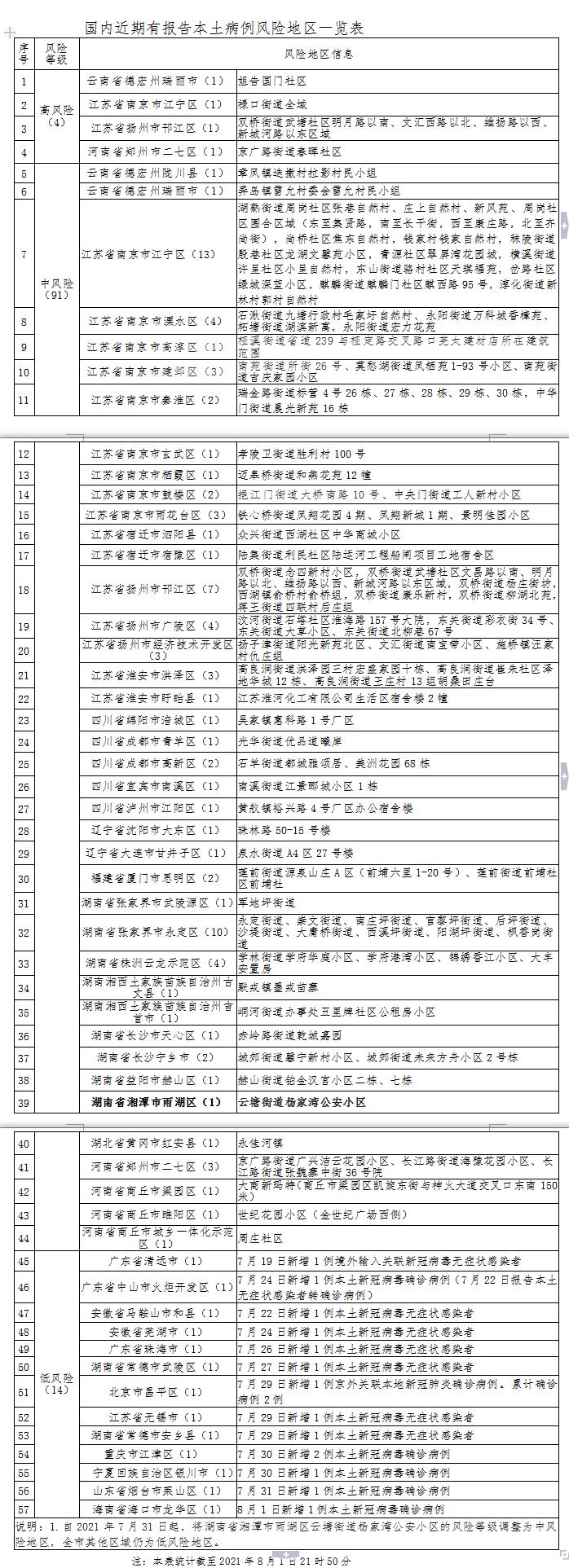 自2021年7月31日起,将湖南省湘潭市雨湖区云塘街道杨家湾公安小区的风险等级调整为中风险地区,全市其他区域仍为低风险地区。