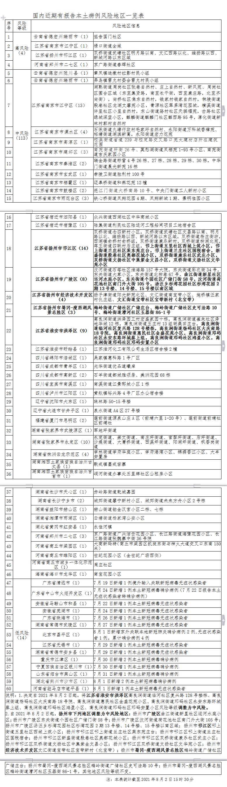 自2021年8月2日起,扬州市下列地区调整为中风险地区:扬州市广陵区曲江街道新星社区运河水庭小区;扬州市广陵区东关街道个园社区广储门街58号;扬州市广陵区汶河街道荷花池社区南门外大街105号;扬州市广陵区汤汪乡杉湾花园社区杉湾花园2期13号楼、14号楼、15号楼以南区域;扬州市邗江区邗上街道五里社区西城上筑小区;扬州市邗江区邗上街道兰庄社区莱东苑庄台;扬州市邗江区邗上街道兰庄社区国税宿舍;扬州市邗江区新盛街道殷巷社区奥都花城小区;扬州市邗江区双桥街道康乐社区武庄小区;扬州市邗江区双桥街道文扬社区中集紫金文昌小区;扬州市邗江区双桥街道文扬社区文华苑小区;扬州市经济技术开发区文汇街道宝带社区宝带新村(北宝带);扬州市蜀冈-瘦西湖风景名胜区梅岭街道广储社区广储庄台;扬州市蜀冈-瘦西湖风景名胜区梅岭街道广储社区史可法路10号;扬州市蜀冈-瘦西湖风景名胜区梅岭街道漕河社区玉器街86-1号。其他地区风险等级不变。