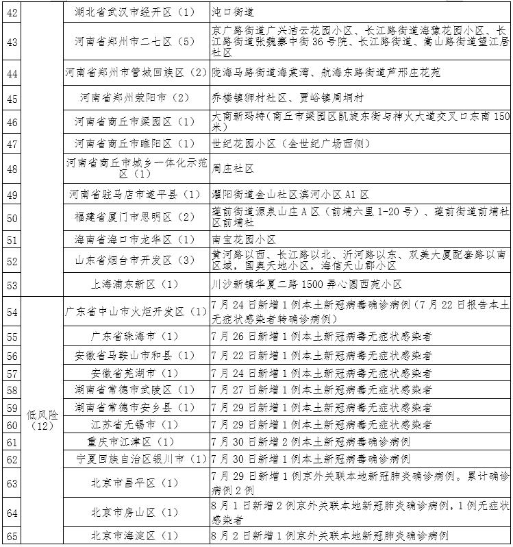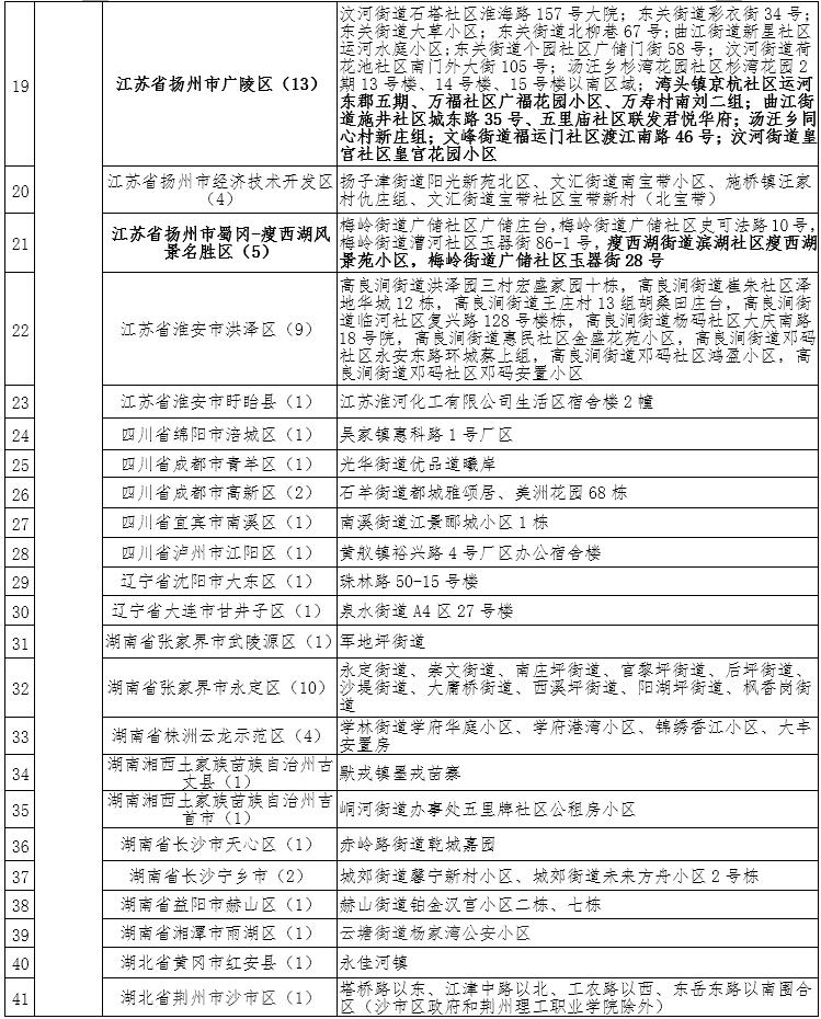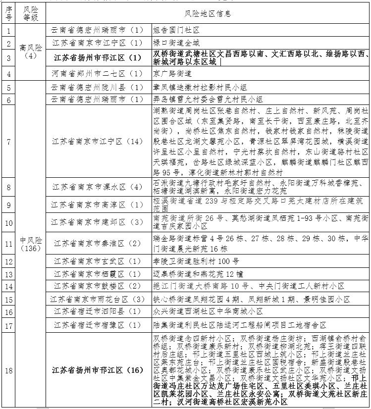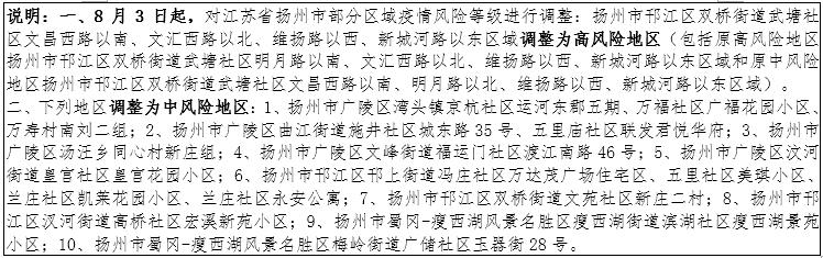8月3日起,对江苏省扬州市部分区域疫情风险等级进行调整:扬州市邗江区双桥街道武塘社区文昌西路以南、文汇西路以北、维扬路以西、新城河路以东区域调整为高风险地区(包括原高风险地区扬州市邗江区双桥街道武塘社区明月路以南、文汇西路以北、维扬路以西、新城河路以东区域和原中风险地区扬州市邗江区双桥街道武塘社区文昌西路以南、明月路以北、维扬路以西、新城河路以东区域)。下列地区调整为中风险地区:1、扬州市广陵区湾头镇京杭社区运河东郡五期、万福社区广福花园小区、万寿村南刘二组;2、扬州市广陵区曲江街道施井社区城东路35号、五里庙社区联发君悦华府;3、扬州市广陵区汤汪乡同心村新庄组;4、扬州市广陵区文峰街道福运门社区渡江南路46号;5、扬州市广陵区汶河街道皇宫社区皇宫花园小区;6、扬州市邗江区邗上街道冯庄社区万达茂广场住宅区、五里社区美琪小区、兰庄社区凯莱花园小区、兰庄社区永安公寓;7、扬州市邗江区双桥街道文苑社区新庄二村;8、扬州市邗江区汊河街道高桥社区宏溪新苑小区;9、扬州市蜀冈-瘦西湖风景名胜区瘦西湖街道滨湖社区瘦西湖景苑小区;10、扬州市蜀冈-瘦西湖风景名胜区梅岭街道广储社区玉器街28号。