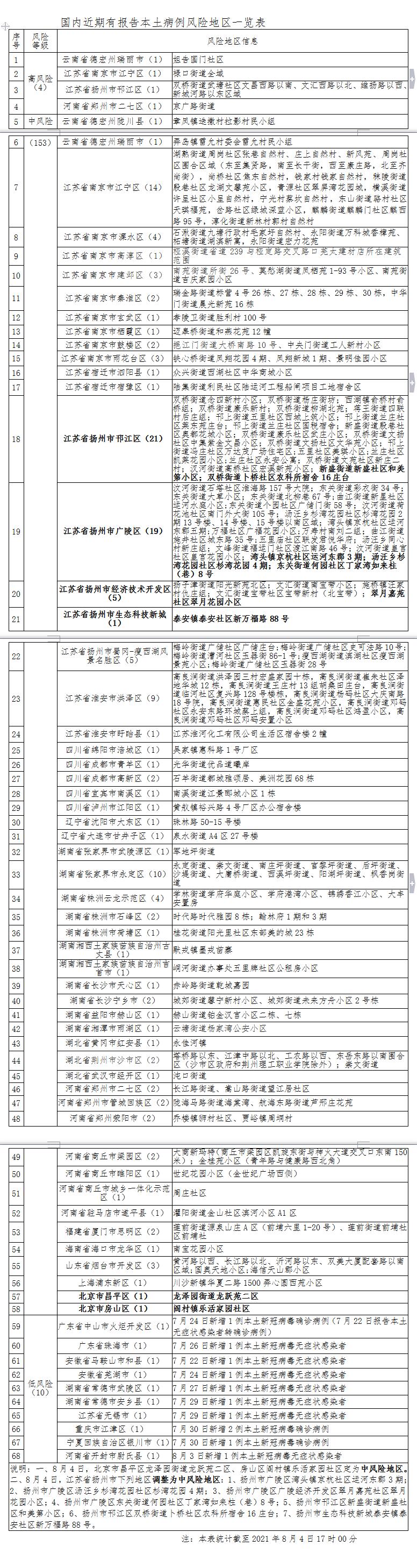 8月4日,江苏省扬州市下列地区调整为中风险地区:扬州市广陵区湾头镇京杭社区运河东郡3期;扬州市广陵区汤汪乡杉湾花园社区杉湾花园4期;扬州市广陵区广陵经济开发区翠月嘉苑社区翠月花园小区;扬州市广陵区东关街道何园社区丁家湾如来柱(巷)8号;扬州市邗江区新盛街道新盛社区和美第小区;扬州市邗江区双桥街道卜桥社区农科所宿舍16庄台;扬州市生态科技新城泰安镇泰安社区新万福路88号。