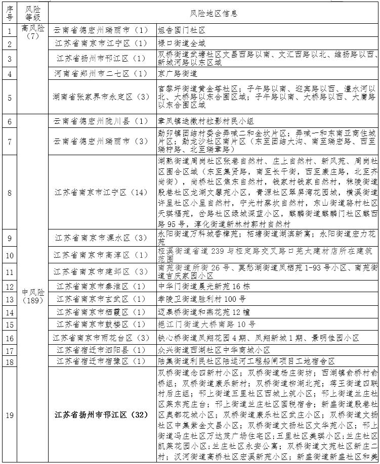 8月6日,江苏省扬州市下列地区调整为中风险地区:扬州市广陵区湾头镇联合村(原中风险地区扬州市广陵区湾头镇联合村陈西组并入);扬州市广陵区东关街道皮市街社区滨河苑小区;扬州市邗江区新盛街道新悦社区华鼎星城小区;扬州市邗江区竹西街道竹西社区月明苑小区一期;扬州市邗江区西湖镇金槐村金槐花园小区。其他地区风险等级不变。