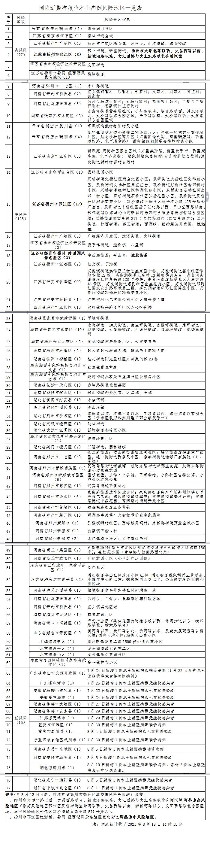 自8月13日日起,江苏省扬州市对部分区域疫情风险等级进行调整:扬州市大学北路以西、文昌西路以南、新城河路以东、文汇西路与文汇东路以北合围区域调整为高风险地区(原高风险地区邗江区双桥街道宝带河以西、文昌西路以南、新城河路以东、文汇西路以北合围区域,原中风险地区邗江区双桥街道文昌中路577号并入)。扬州市邗江区槐泗镇、蜀冈-瘦西湖风景名胜区城北街道调整为中风险地区。其他地区风险等级不变。