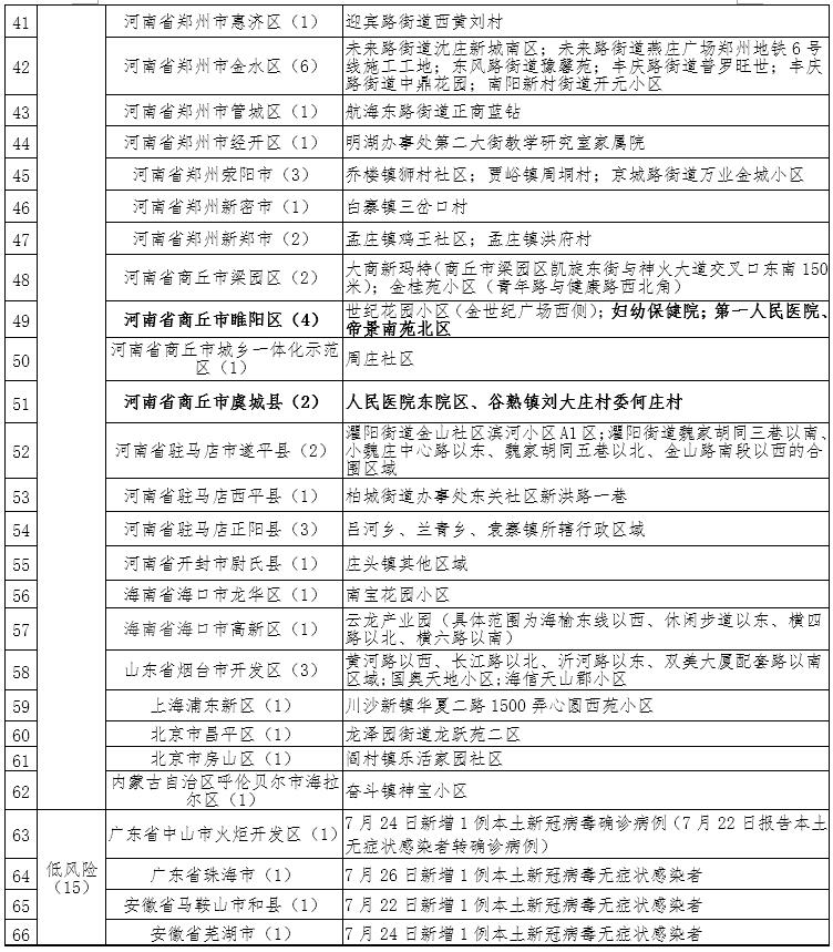 2021年8月13日起,将河南省商丘市第一人民医院、帝景南苑北区、睢阳区妇幼保健院、虞城县人民医院东院区、虞城县谷熟镇刘大庄村委何庄村疫情风险等级调整为中风险地区。