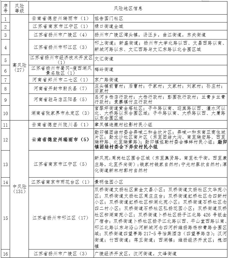 自2021年8月13日20:00起,将云南省瑞丽市勐卯镇团结村委会下弄安村民小组调整为中风险地区。