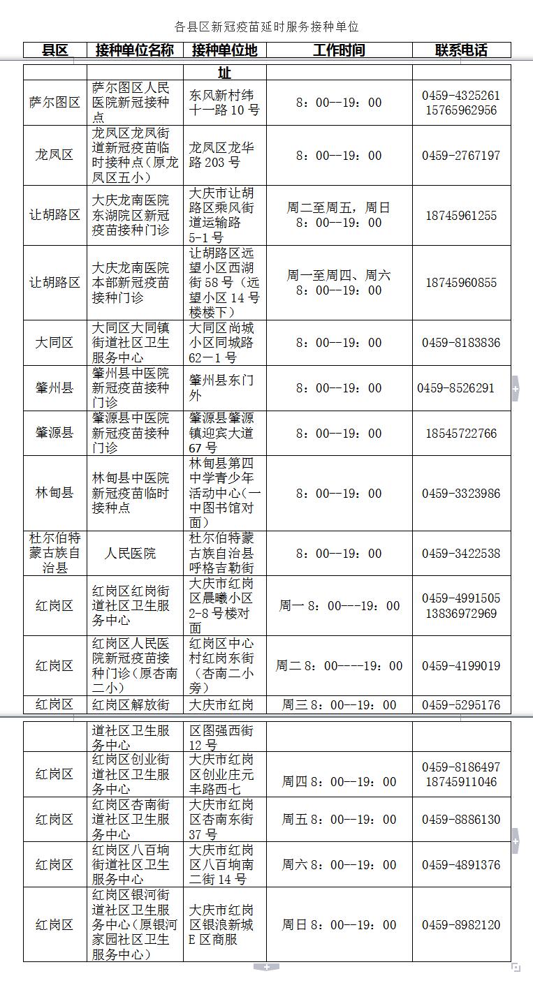 为保障我市居民新冠疫苗早接种早保护早受益,近期全市各县区每日均有1家接种单位开展延时服务,接种时间为早8点至晚19时、周六周日不休息,其他新冠疫苗接种单位按照县区指挥部的安排,有序开展新冠疫苗接种工作。