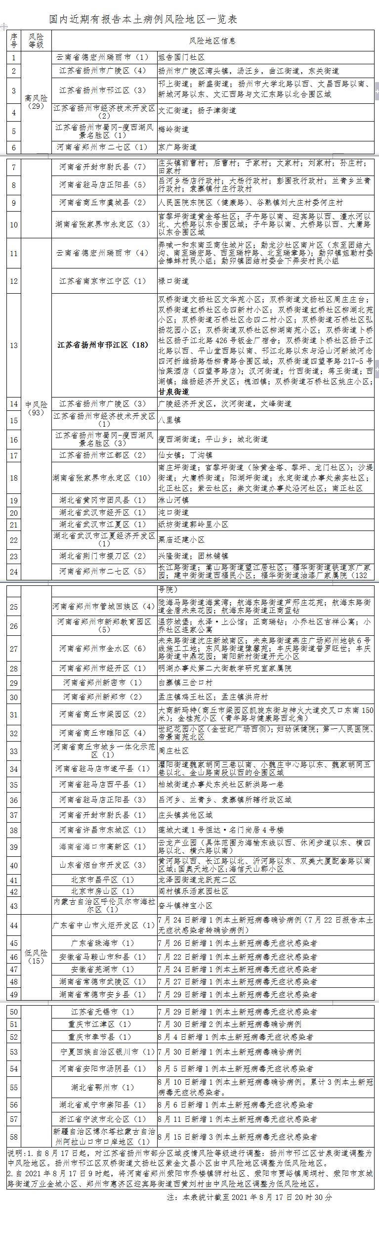 自8月17日起,对江苏省扬州市部分区域疫情风险等级进行调整:扬州市邗江区甘泉街道调整为中风险地区。扬州市邗江区双桥街道文扬社区紫金文昌小区由中风险地区调整为低风险地区。