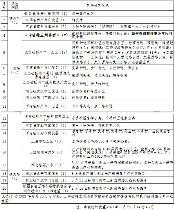 自2021年8月25日8时起,云南省德宏州瑞丽市勐卯镇姐勒村委会南闷村民小组调整为中风险地区,其他地区风险等级不变。