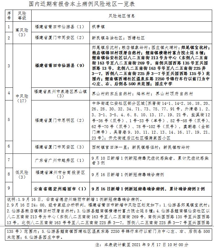 9月16日24:00福建省莆田市新增6处中风险区,划定如下:1.仙游县郊尾镇宝坑村;2.仙游县赖店镇锦田村顶厝自然村;3.仙游县鲤南镇横塘村富力院士廷8幢;4.仙游县鲤南镇仙安社区以八二五南街213号为中心(东侧八二五南街163号至八二五南街269号,南侧兴国西路135号至兴国西路13号,北侧八二五南街163号号至八二五南街225弄3—7,西侧八二五南街225弄3—7号至兴国西路135号)范围内;5.仙游县鲤南镇西埔社区温泉东路2250号锦行车行以前门为中心左、右、后侧各500米范围;6.仙游县园庄中学。其他地区风险等级不变。
