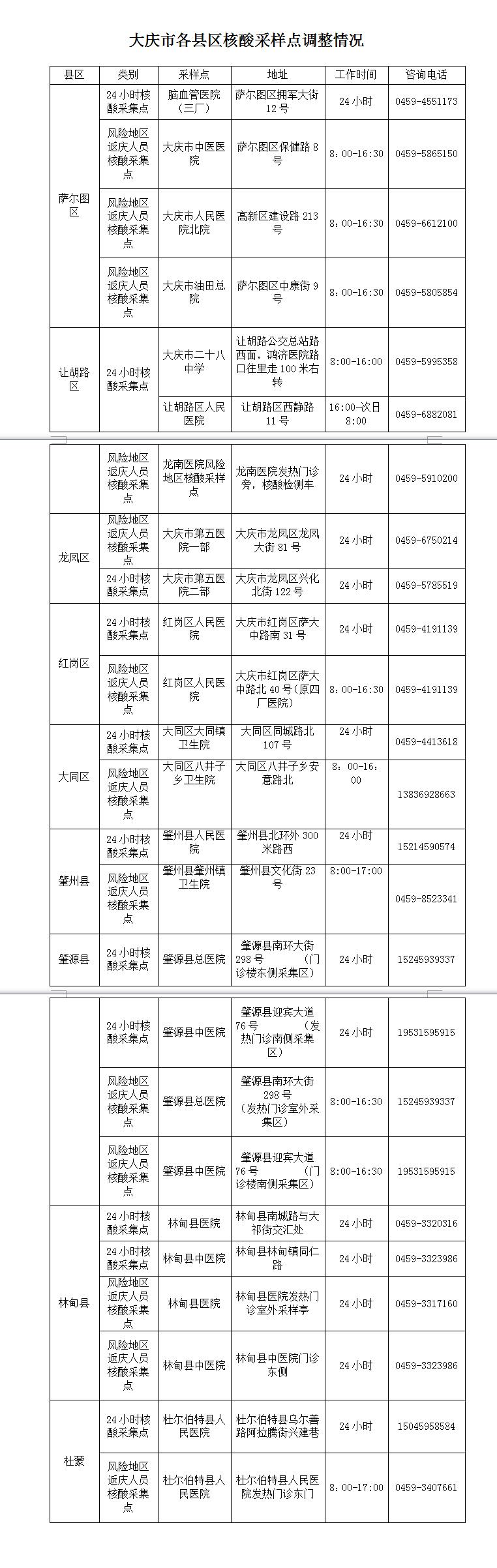 为切实做好国内外重点地区来抵返庆人员新冠病毒核酸检测筛查工作,为居民提供更方便、更快捷、更精准的核酸检测服务,现将大庆市各县区核酸采样点设置情况公示如下: