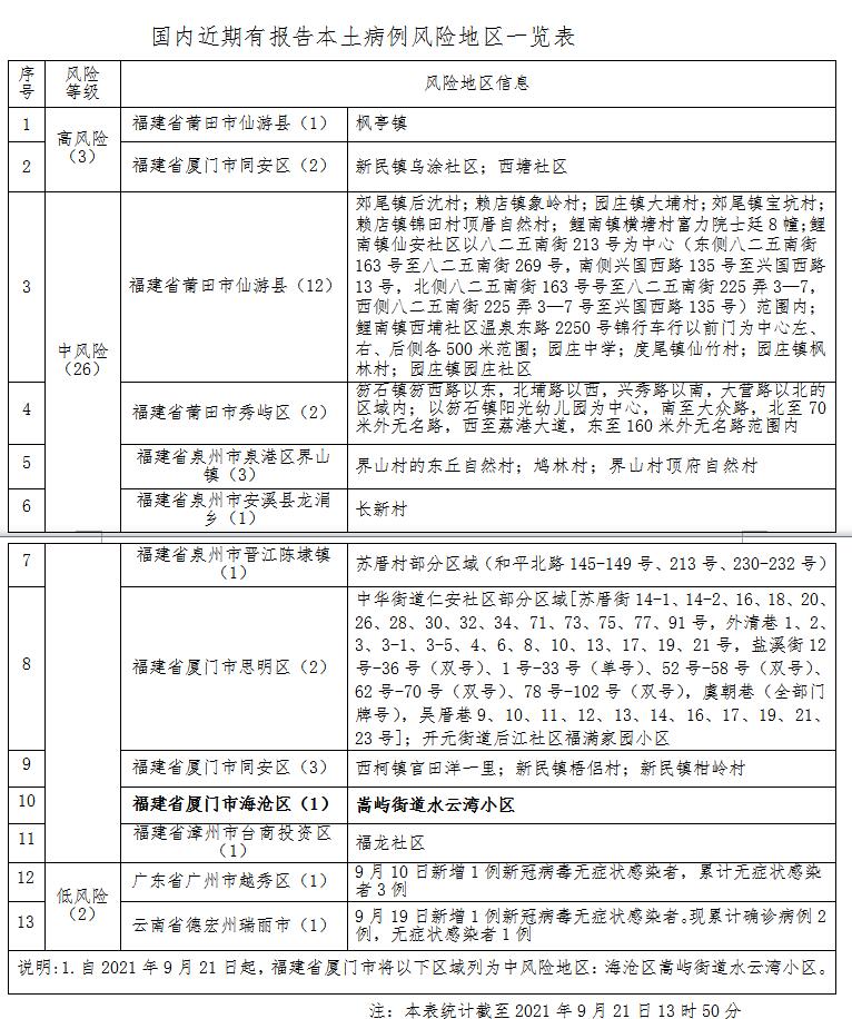 自2021年9月21日起,福建省厦门市将以下区域列为中风险地区:海沧区嵩屿街道水云湾小区。其他地区风险等级不变。